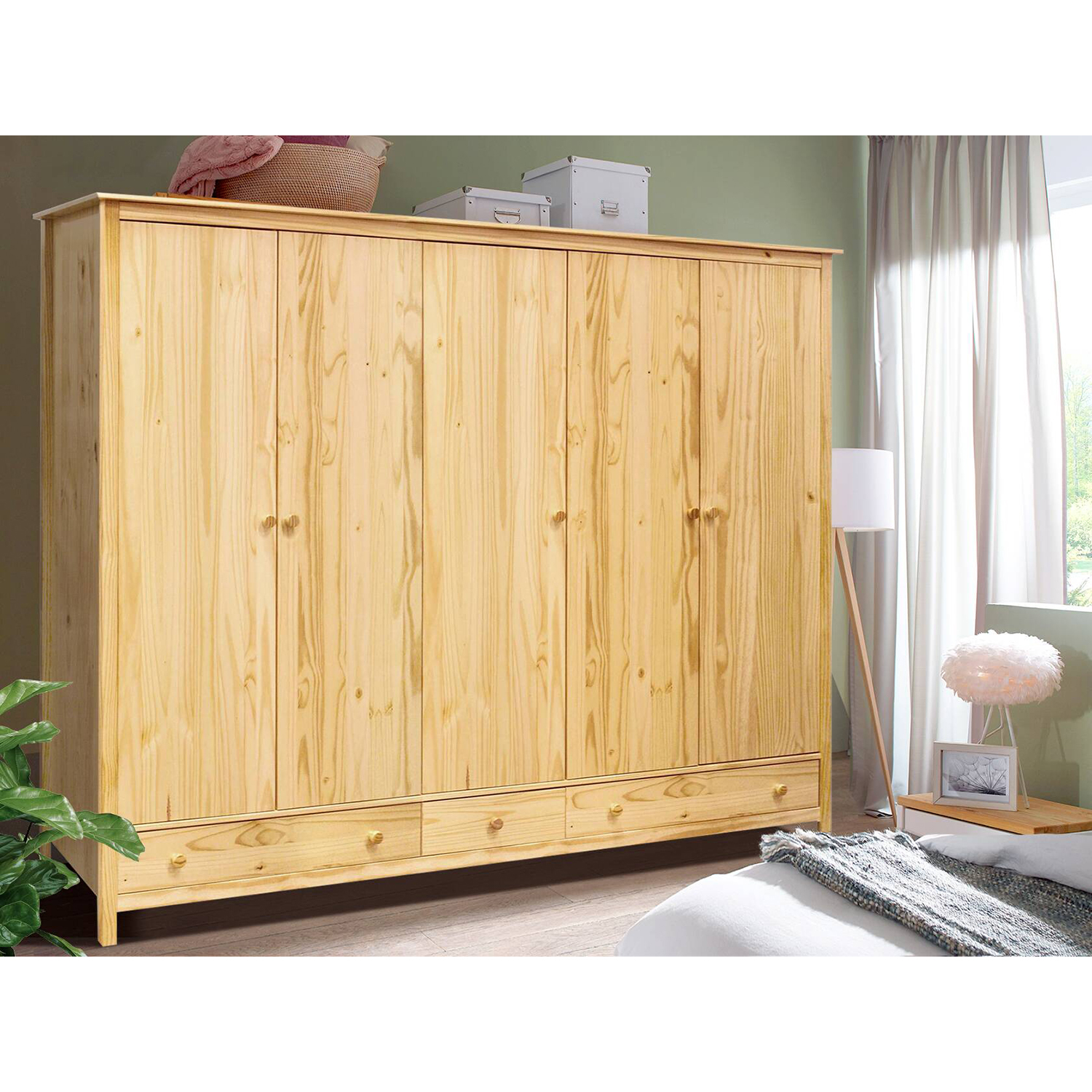 Ha Ön nagycsaládos, vagy csak szereti a divatot és sok ruhája van, a TORINO 5 ajtós gardróbszekrény kielégítheti az igényeit. Tömör fenyőfából készült, és lakkozott kivitelben kapható. A gardróbszekrényben lévő hely 2:1:2 arányban készült. A bal és jobb oldali szélesebb részen tágas szekrénysáv és polcok találhatók az idényruhák vagy kalapok számára. A ruhákat, kabátokat, dzsekiket vagy ingeket aztán a szekrényrúdra akaszthatja. A középső keskeny részen 3 polc található a pólók és pulóverek tárolására. Az alsó részben 3 fiók található fém futókkal, ott ismét tárolhatja fehérneműit. Mivel a szekrény valóban nagyon tágas, biztosan talál benne helyet az ágyneműnek is. Nemcsak egy nyaralóban vagy egy víkendházban, hanem egy modern házban is jól fog mutatni.
