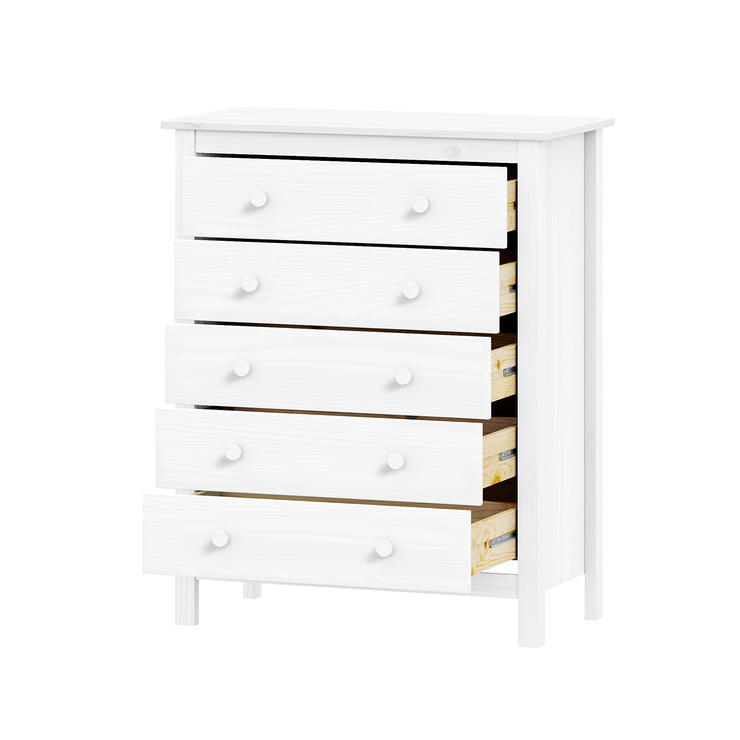 tömör fenyő anyag, fehér lakkozás és öt fiók fém futókkal