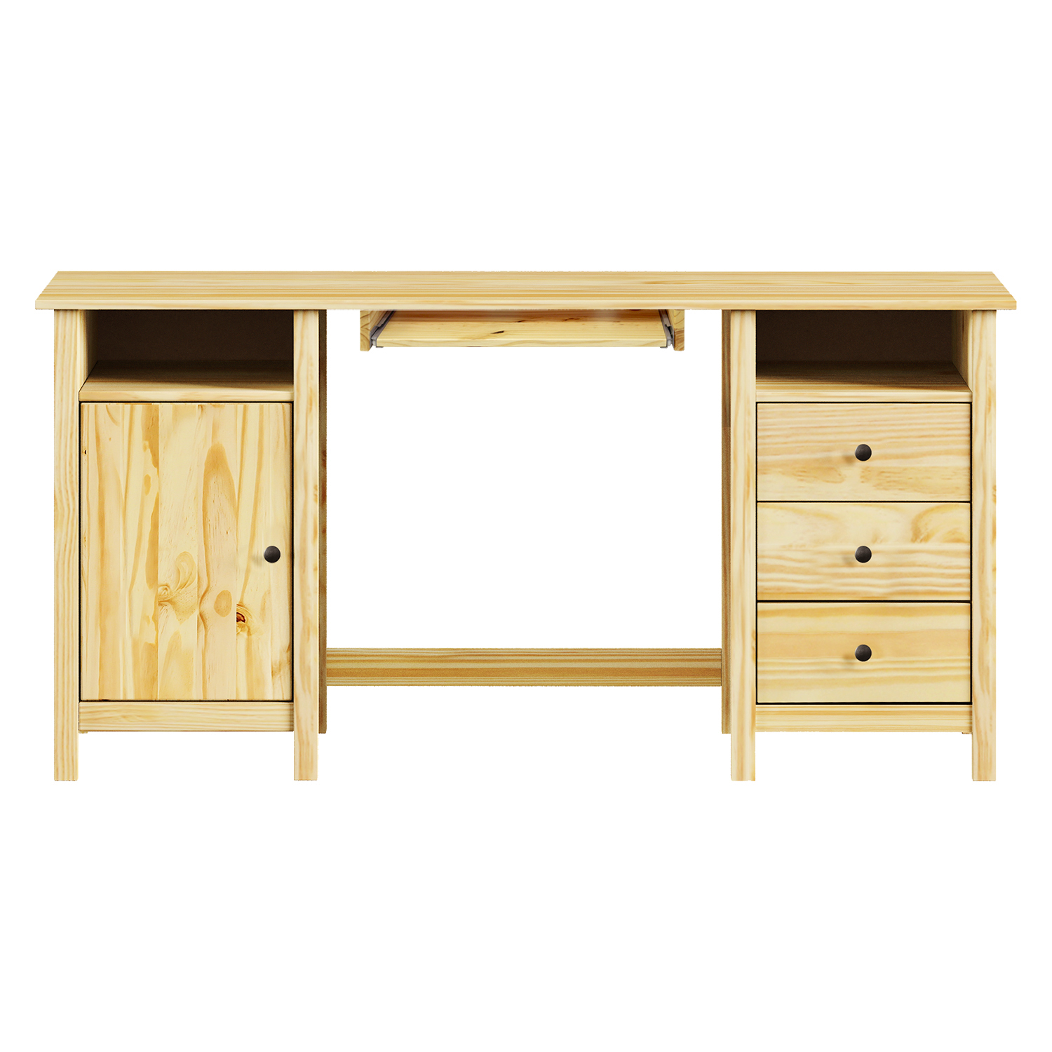 Termékkód: 8089Kanyaga tömör fenyő, lakkozott kivitelben fém fogantyúk 3 fiók fém csúszókkal, 1 polc kihúzható billentyűzetlap nem tartozék az asztalhoz kihúzható billentyűzetlap is rendelhető 8840
