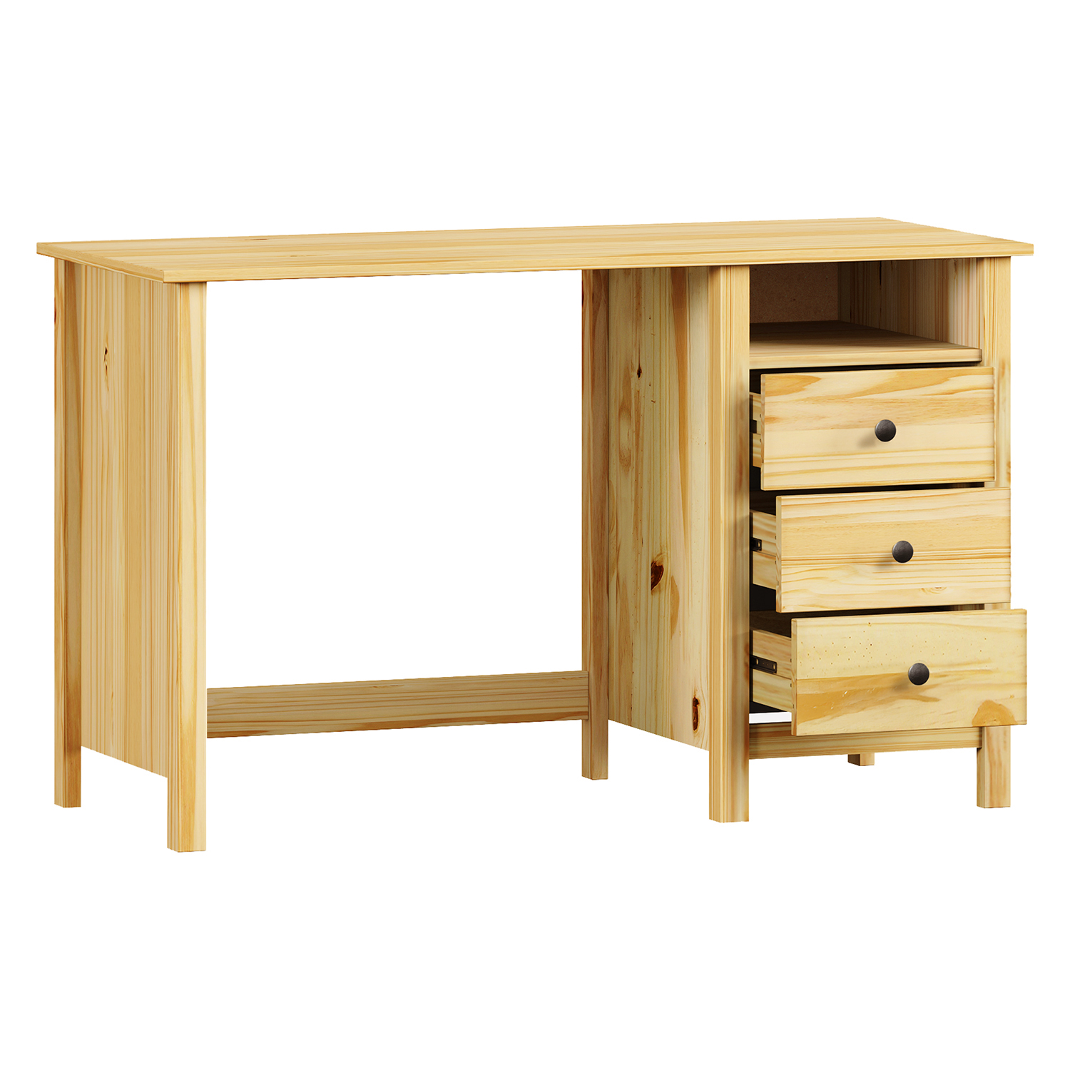 Termékkód: 8073Kanyaga tömör fenyő, lakkozott kivitelben fém fogantyúk 2 nyitott polc, 1 ajtó és 3 fiók fém futókkal kihúzható nem tartozék az asztalhoz kihúzható billentyűzetlap is rendelhető 8840