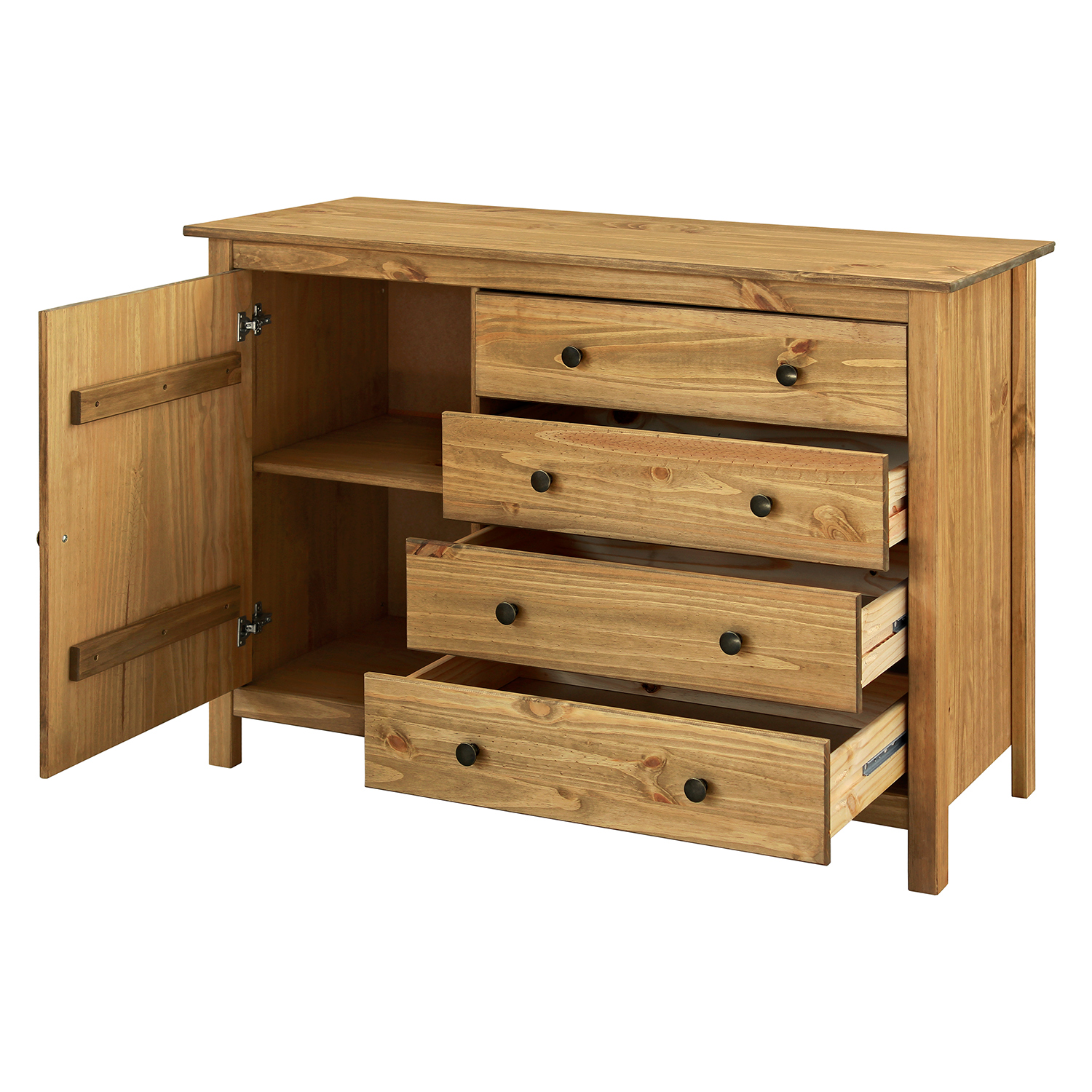 Termékkód: 8073Vanyaga tömör fenyő, méz árnyalatban viaszoltfém fogantyúk feketére festett sárgarézből2 nyitott polc, 1 ajtó és 3 fiók fém futókkal