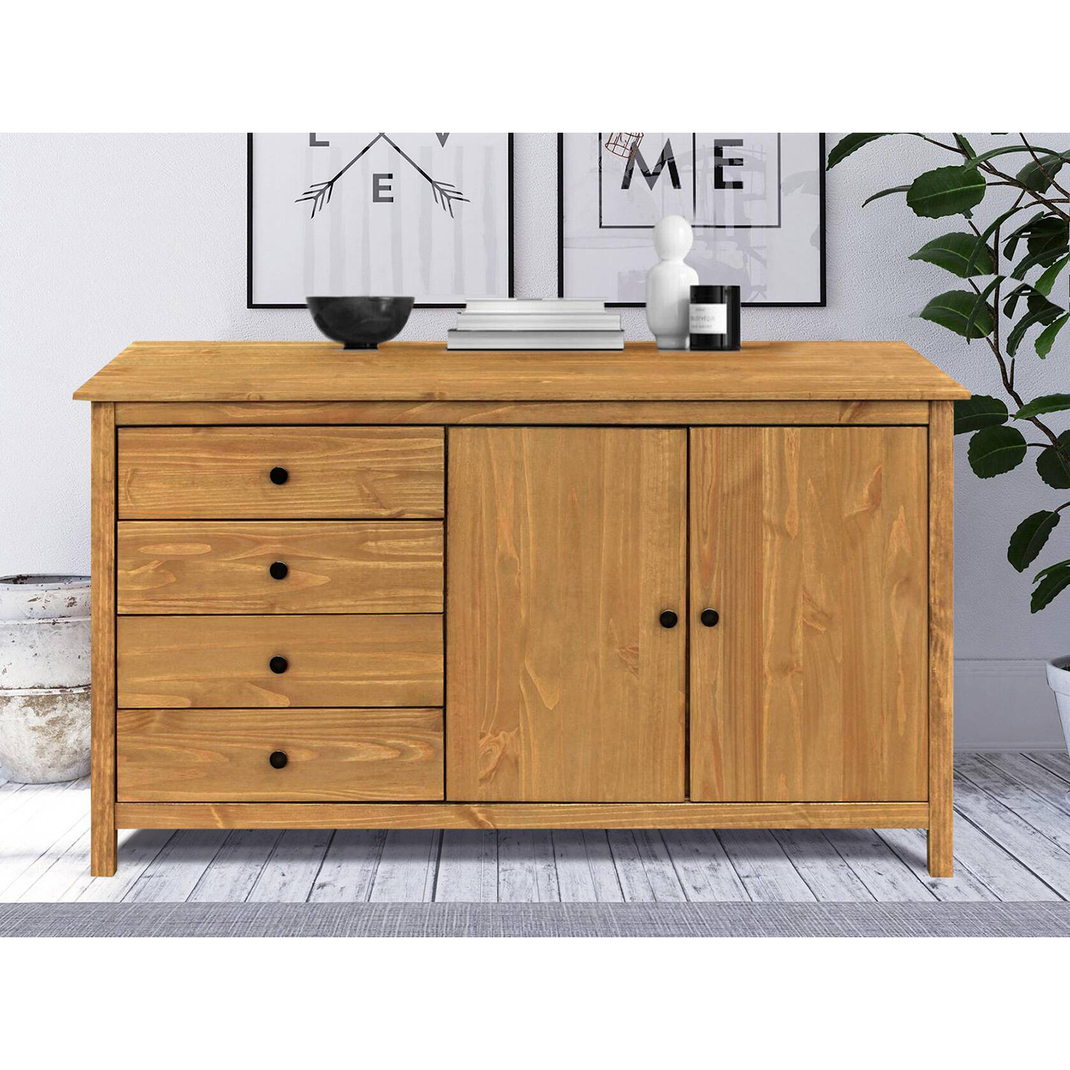 Termékkód: 8079Vanyaga tömör fenyő, méz árnyalatban viaszoltfém fogantyúk feketére festett sárgarézből2 ajtó és 2 fiók fém futókkal