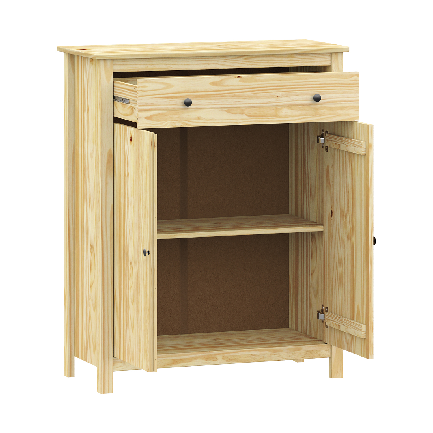 Termékkód: 8061Kanyaga tömör fenyő, lakkozott kivitelbenfém fogantyúk fekete sárgarézből3 fiók fémfutókkal, 3 tömör ajtó, 2 polca maximális terhelhetőségek az összeszerelési útmutatóban szerepelnek