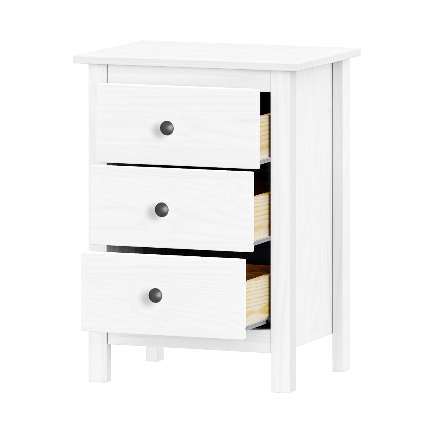 Termékkód: 8077BKanyaga tömör fenyő, színe fehér lakk fém fogantyúk 3 fiók fém csúszókkal, 1 polc