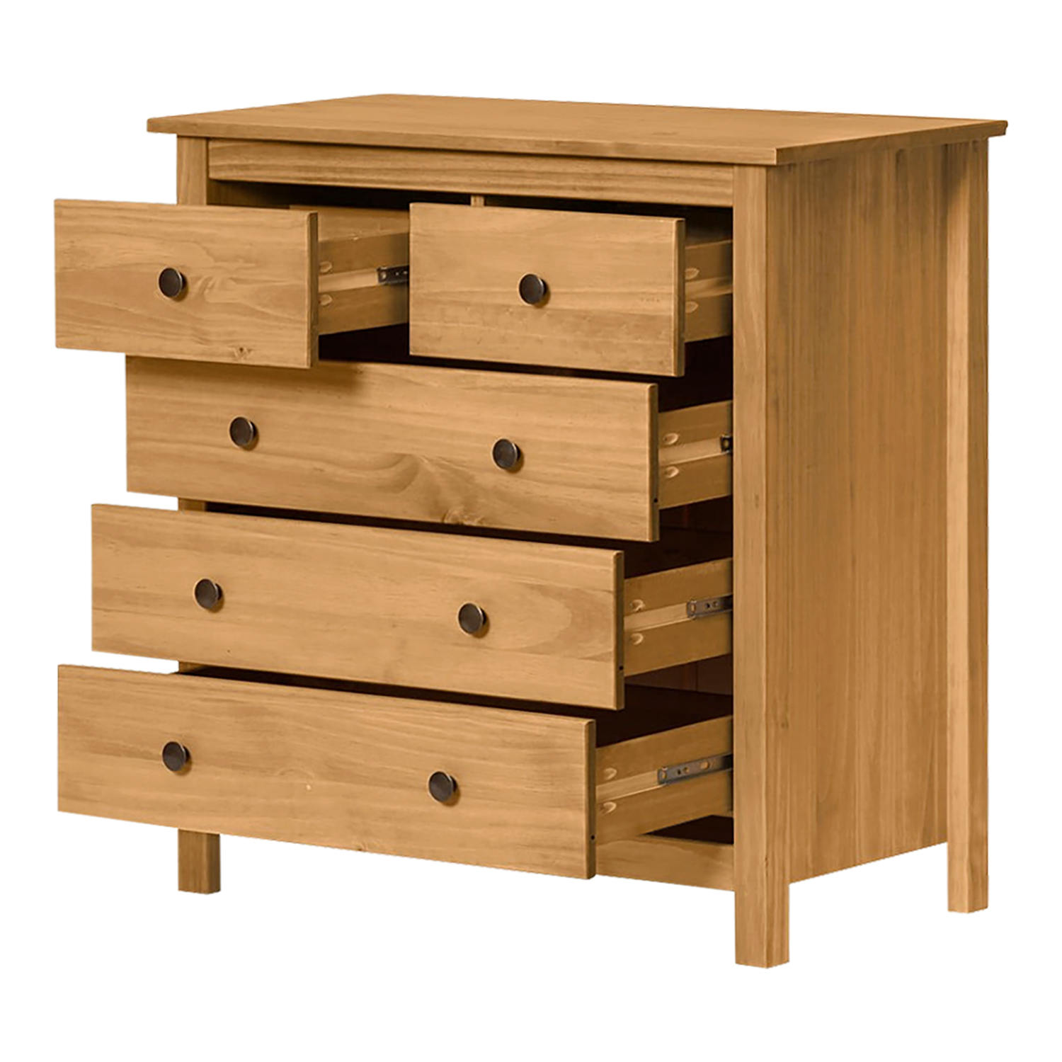 Termékkód: 8096Vanyaga tömör fenyő, méz árnyalatban viaszolt fém fogantyúk sárgarézből öt fiók fémfutókkal