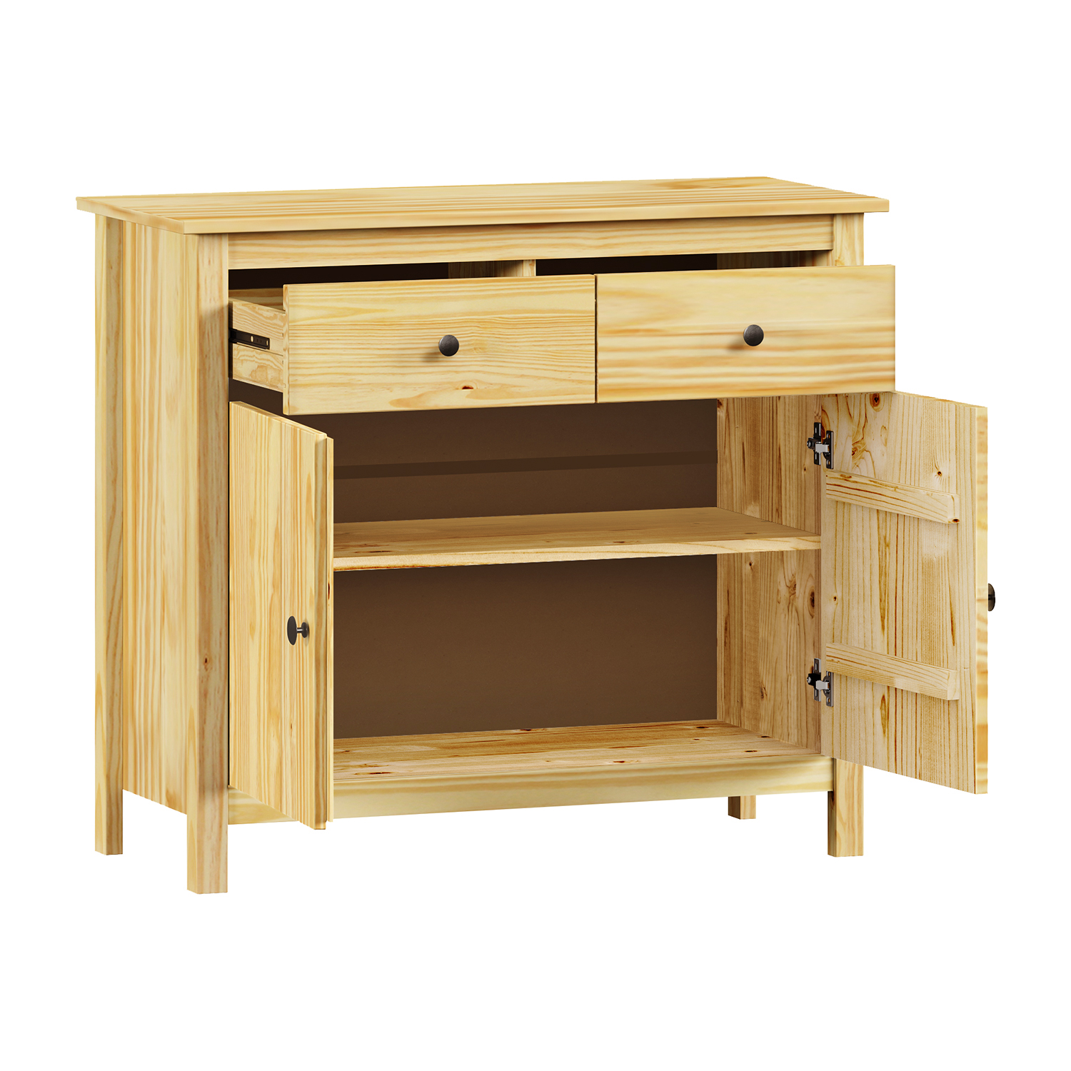 Termékkód: 8079Kanyaga tömör fenyő, lakkozott kivitelbenfém fogantyúk fekete sárgarézből2 ajtó és 2 fiók fém futókkal