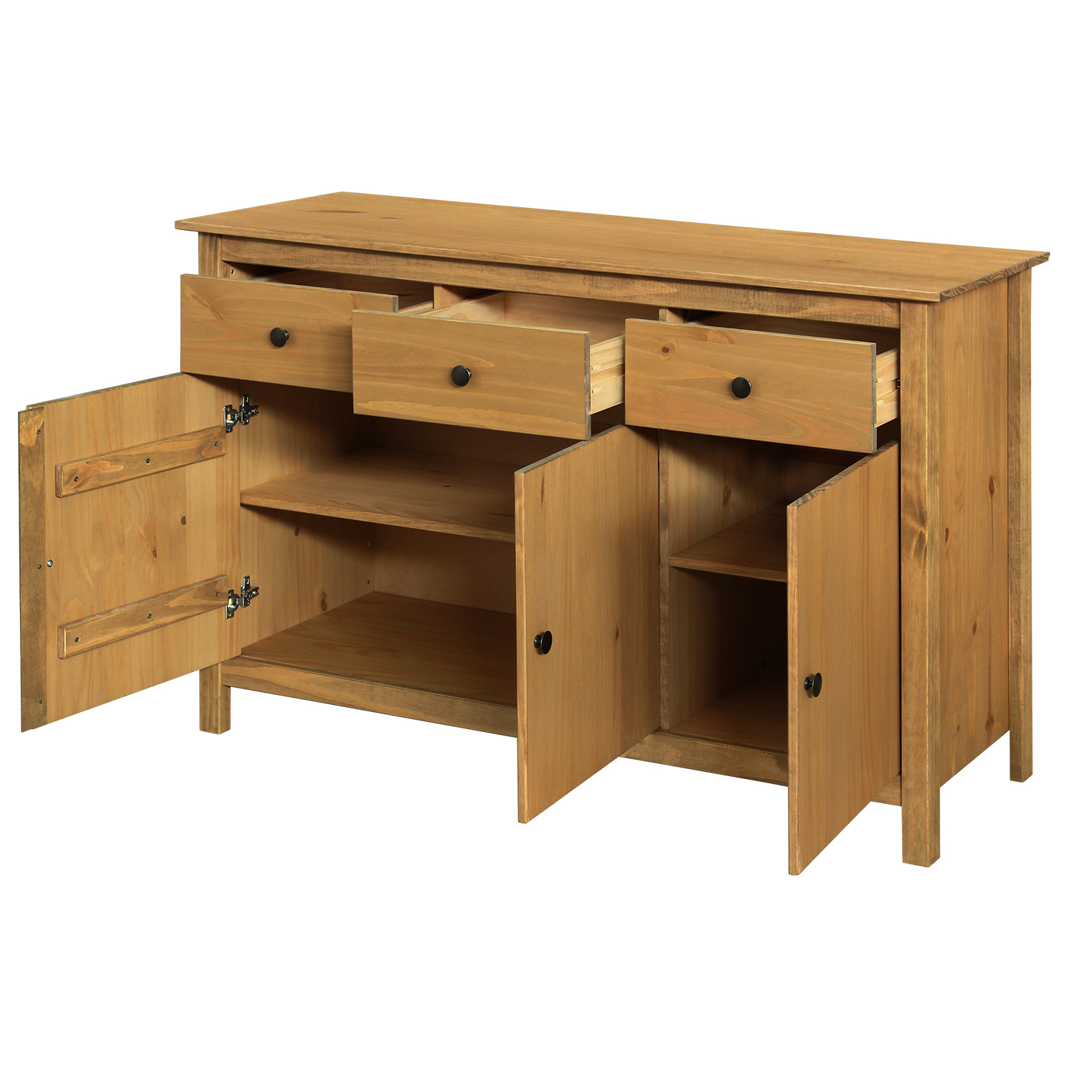 Termékkód: 8061Vanyaga tömör fenyő, méz árnyalatban viaszoltfém fogantyúk feketére festett sárgarézből3 fiók fém futókkal, 3 tömör ajtó, 2 polca maximális terhelhetőségek az összeszerelési útmutatóban szerepelnek