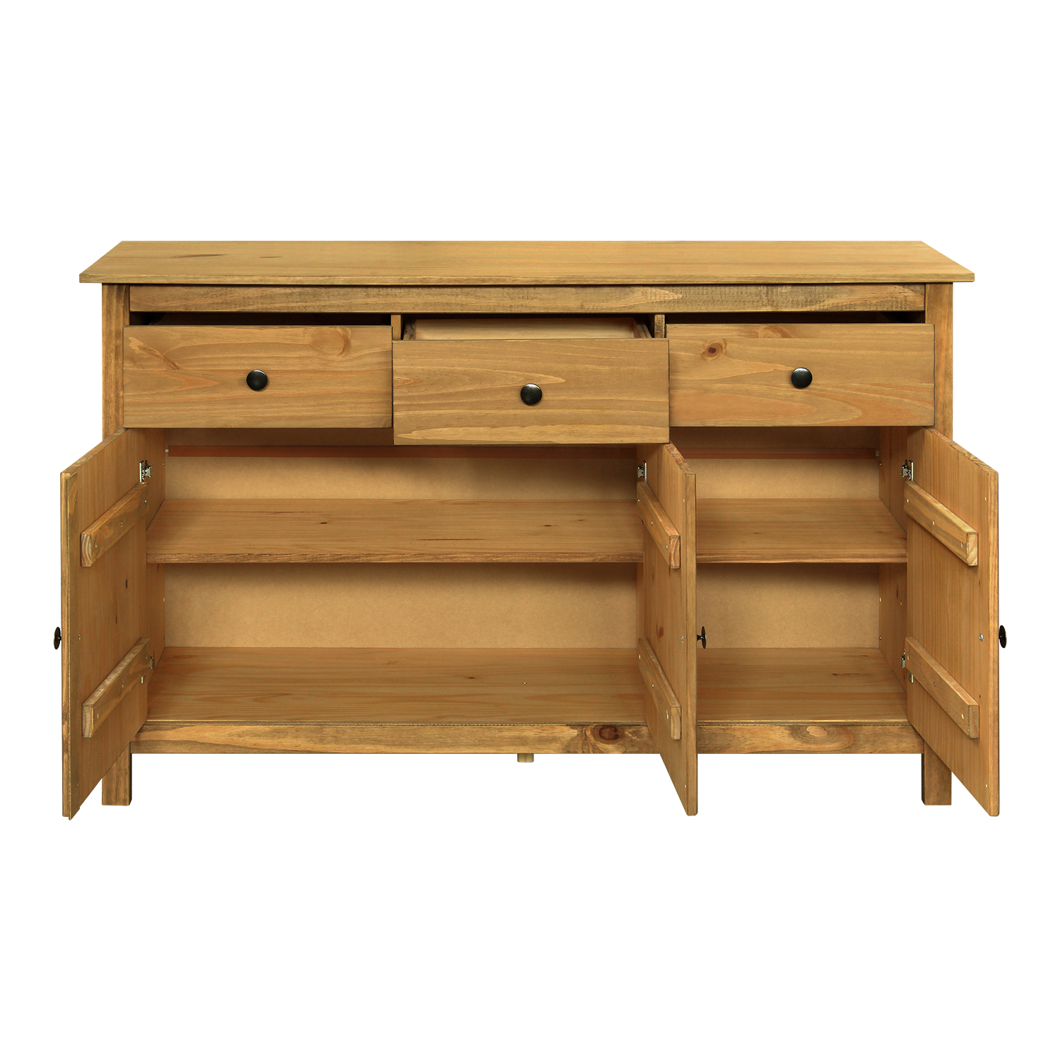 Termékkód: 8076Vanyaga tömör fenyő, méz árnyalatban viaszoltfém fogantyúk feketére festett sárgarézből3 ajtó és 2 fiók fém futókkal