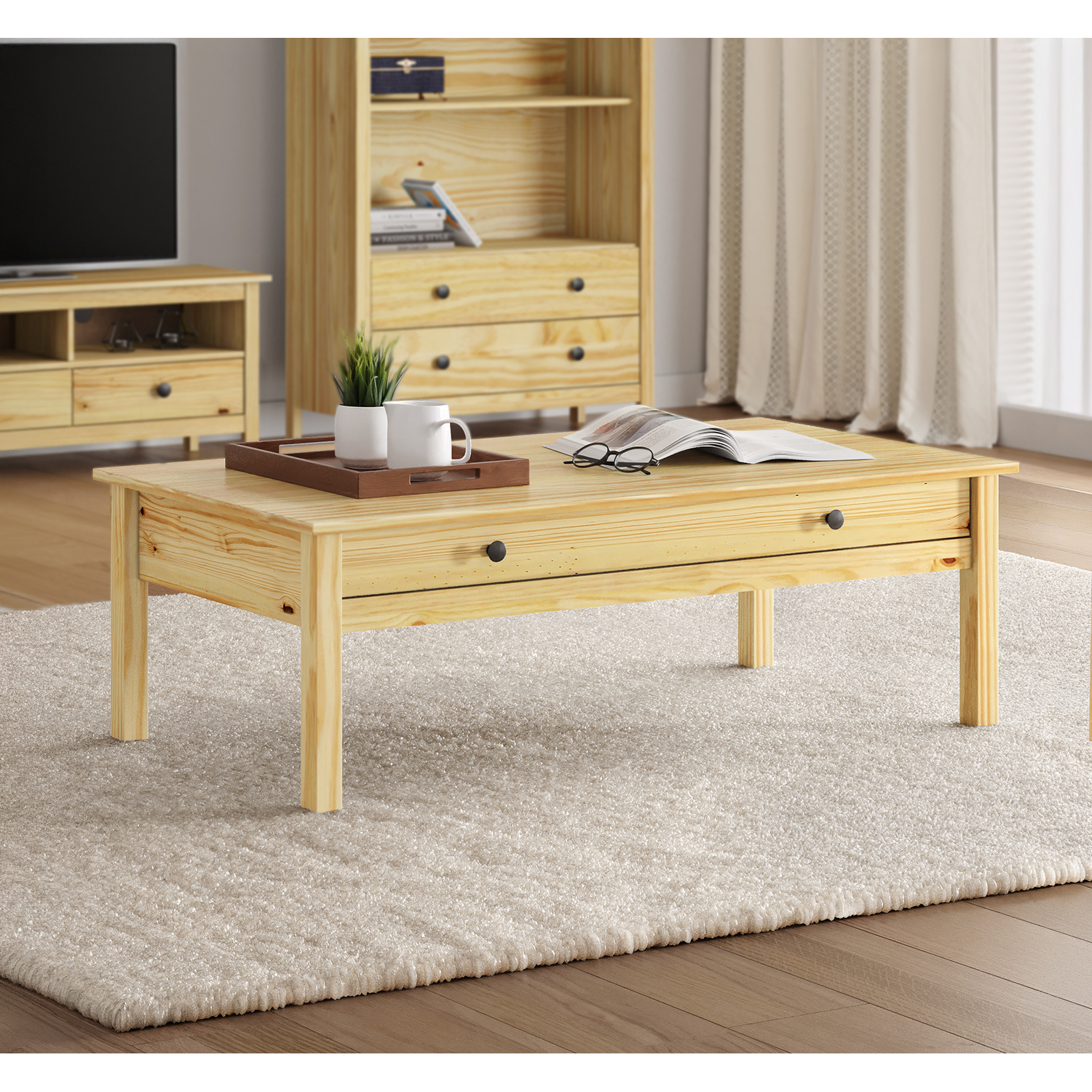 A TORINO TV-asztal egy olyan bútordarab, amely becsületes kivitelezésével és természetes esztétikájával nyeri el tetszését. Tömör fenyőfából készült, és lakkozott, hogy kiemelje a fa szemcsézettségét, ugyanakkor megőrizze tartósságát és könnyű karbantarthatóságát. Minden részlete átgondoltnak és masszívnak tűnik. A fő tárolóhelyen egy hagyományos televízió és kisebb dekorációk is elférnek. Alatta praktikus fiókokat és egy nyitott teret talál, ahol könnyedén tárolhatja az elektronikát vagy kedvenc magazinjait. A fém fogantyúk kiemelik az egyszerű megjelenést, miközben biztosítják a fiókok kényelmes nyitását. Az általános kialakítás időtálló és kissé rusztikus, de felesleges díszítés nélkül. Modern belső terekbe éppúgy illik, mint egy rusztikus elemeket tartalmazó házikóba vagy lakásba.